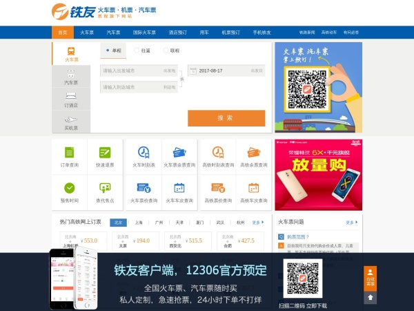 铁友网官网 火车票网上订票(全称:火车票网上订票_12306火车票网上订票_网上订火车票【铁友网官网】)于2022年05月09日收录在本站票务预订分类目录,并成功建立了索引服务,供搜索引擎抓取/蜘蛛爬行/用户查找/检索服务;截至目前为止,本站已有 1224个网友浏览了铁友网官网 火车票网上订票网站。