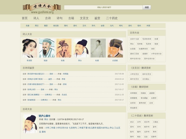 古诗大全300首(全称:古诗大全_古诗大全300首)于2022年05月15日收录在本站书籍网站分类目录,并成功建立了索引服务,供搜索引擎抓取/蜘蛛爬行/用户查找/检索服务;截至目前为止,本站已有 2493个网友浏览了古诗大全300首网站。